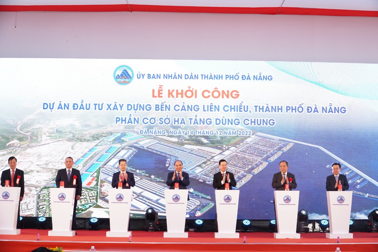 Chủ tịch nước Nguyễn Xuân Phúc, Thường trực Ban Bí thư Võ Văn Thưởng cùng lãnh đạo TP. Đà Nẵng bấm nút khởi công xây dựng bến cảng Liên Chiểu