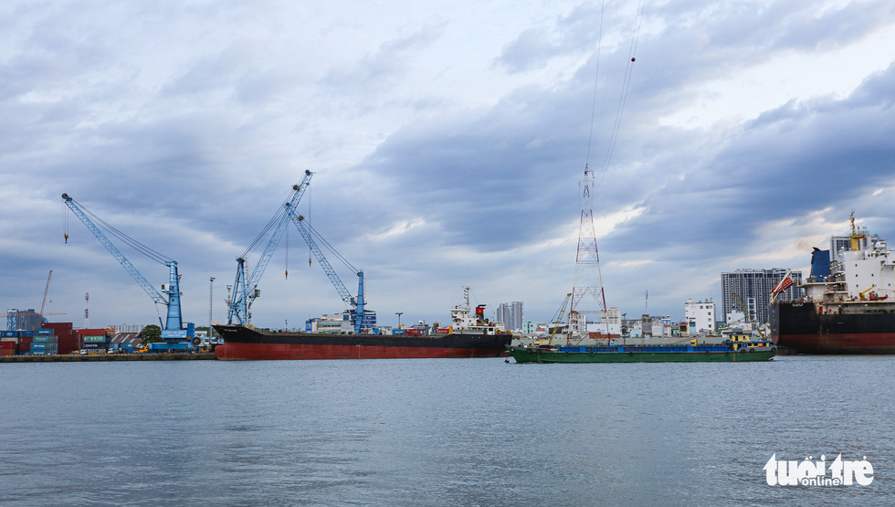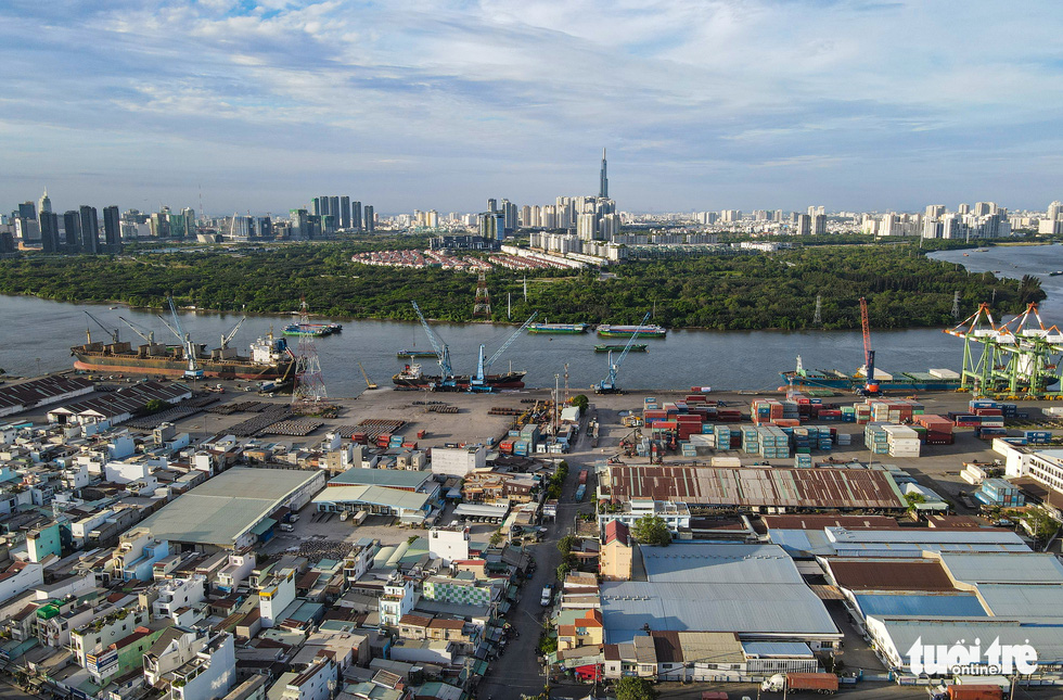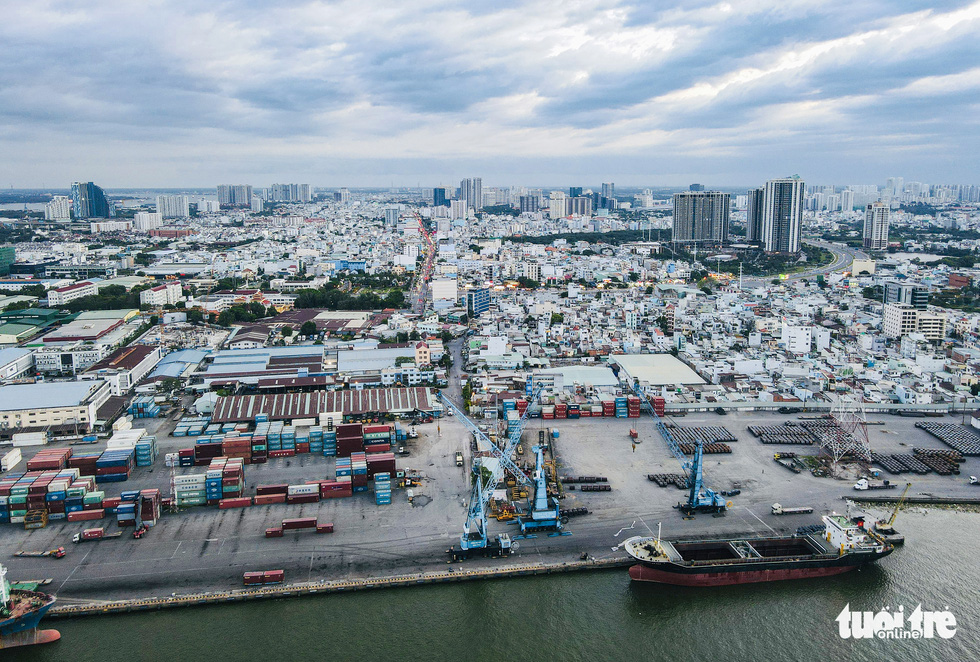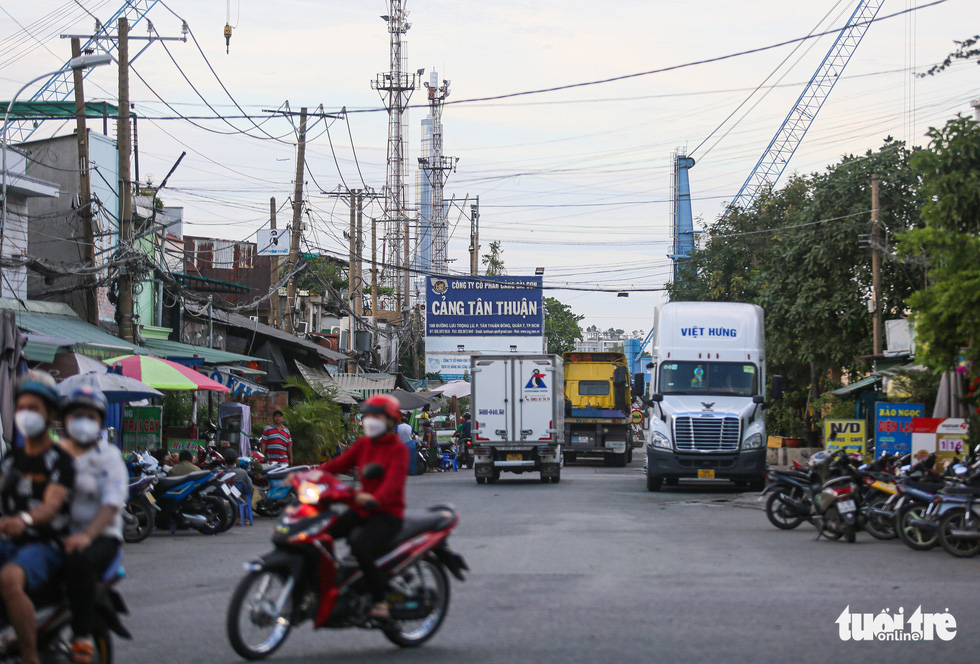 Trên đường Lưu Trọng Lư (quận 7) hướng vào cảng Tân Thuận có đông xe cộ đi lại mỗi ngày, đặc biệt là xe tải lớn, xe container. Do đó, trong thời gian tới cảng này cũng được tính toán dời đi bến hiện hữu để phục vụ cho việc xây cầu Thủ Thiêm 4 – Ảnh: CHÂU TUẤN