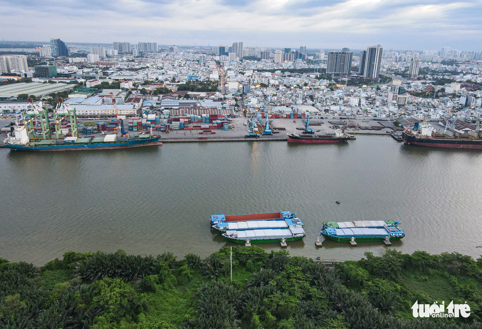 Khi chưa có cầu, ban ngày xe lớn buộc phải vòng đi quốc lộ 1 hoặc đi đường Võ Chí Công (cầu Phú Mỹ) để về hướng quận 7, Nhà Bè… Do đó, thời gian đi từ quận 7, Nhà Bè sang hướng khu đô thị Thủ Thiêm, TP Thủ Đức cũng sẽ được rút ngắn đáng kể khi cầu được xây xong – Ảnh: LÊ PHAN