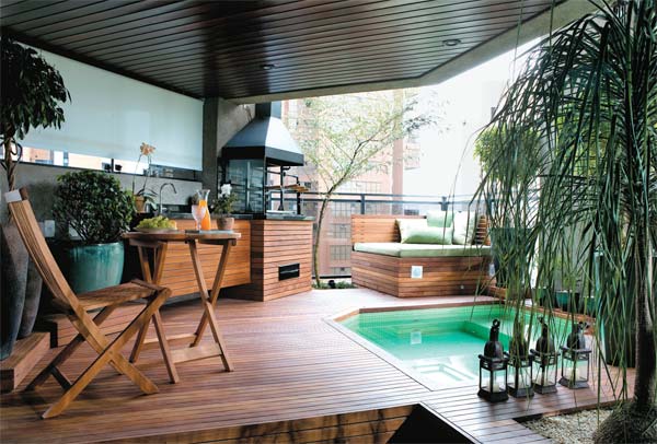Nếu khoảng không ngoài ban công của ngôi nhà đủ lớn, bạn có thể thiết kế một bể bơi nhỏ hoặc bể sục tại đây để có thể đắm mình trong làn nước mát giữa mùa hè.